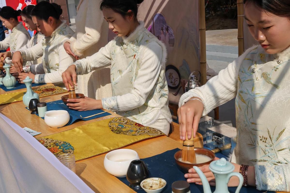 1月16日,武夷山旅游职业中专学校学生在建校50周年教育教学成果展上表演宋代点茶。(邱汝泉 摄)