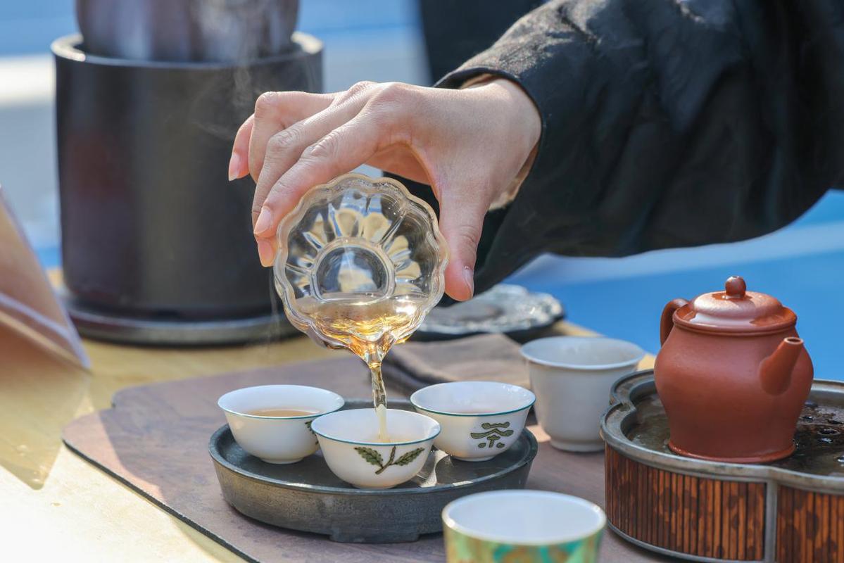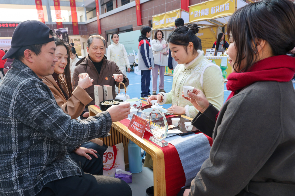 1月16日,武夷山旅游职业中专学校校友在建校50周年教育教学成果展上品武夷岩茶。(邱汝泉 摄)