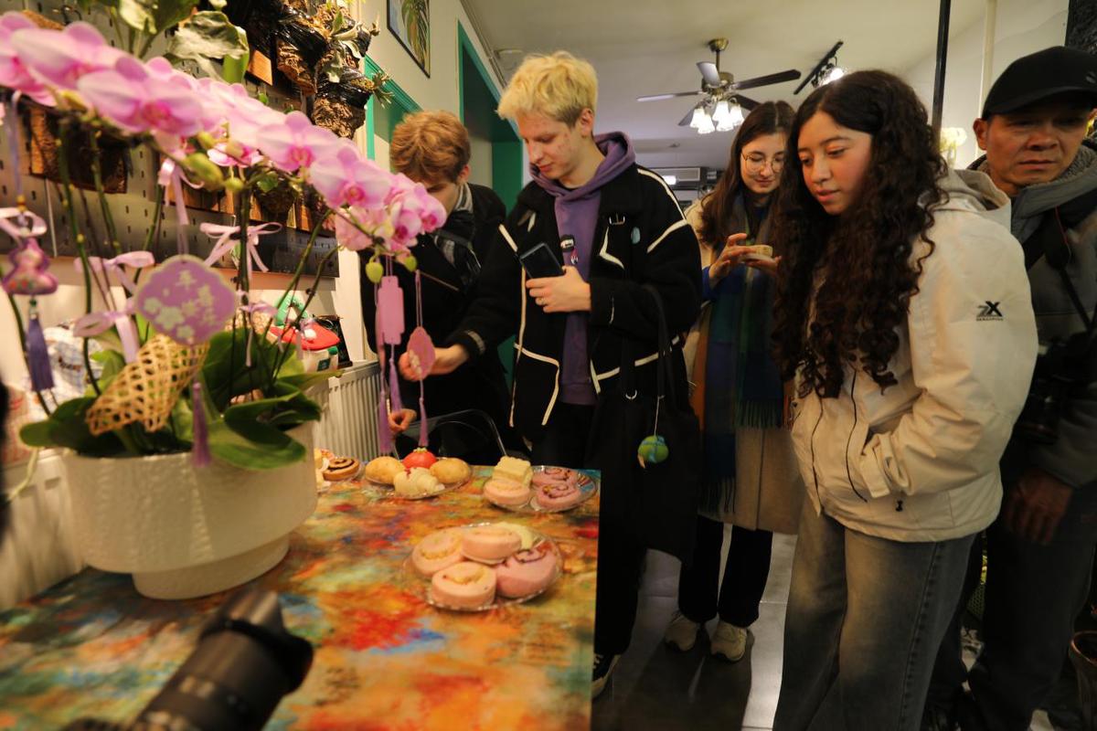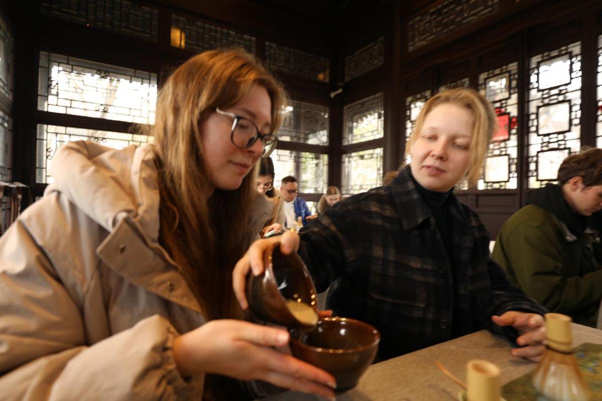 “这些园林并非简单的复制,”园区讲解员解释道,“我们是在深入研究古代园林技艺后,结合当代的材料与工艺进行转译,目的是与时俱进的传承,不是简单的外观模仿。”这种“现代表达”的理念,在随后的宋式点茶体验中变得可触可感。国际友人在老师的指导下,亲手执壶,学习古法,体验传统文化的魅力。