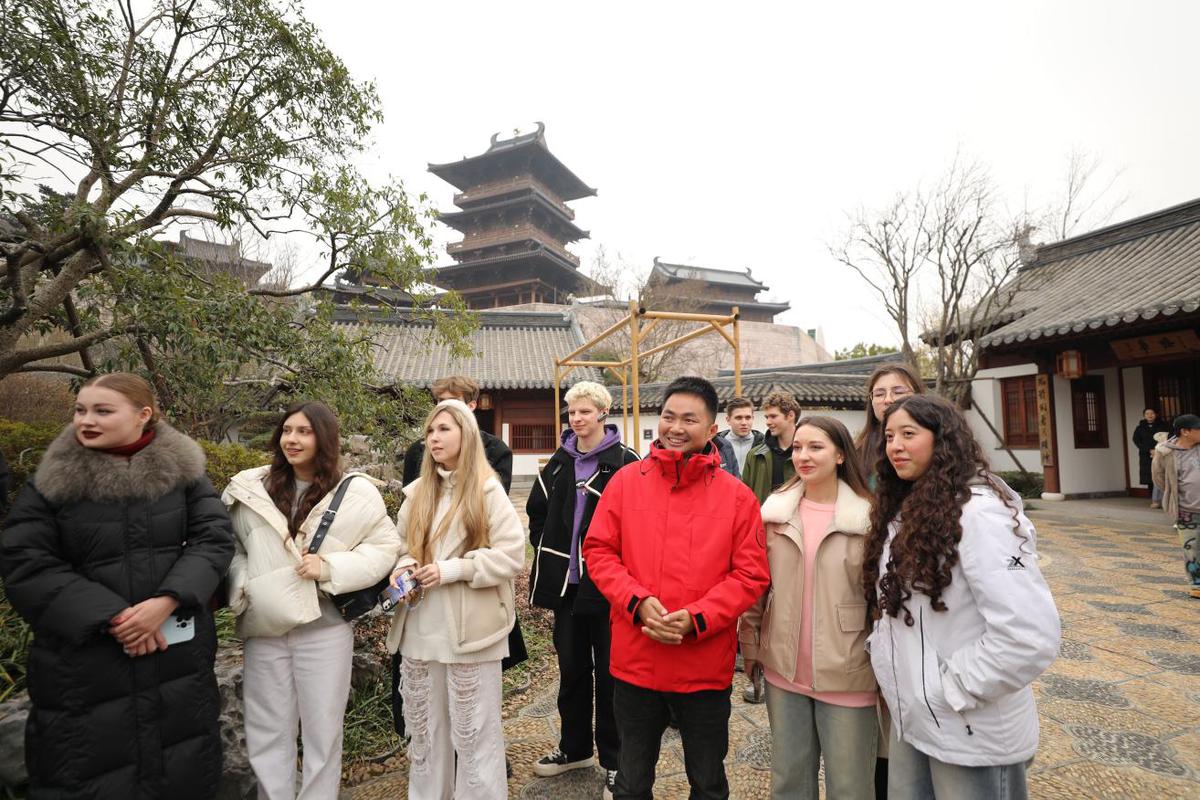 行程的终点落在江苏园博园。这里曾是被开采的矿坑,如今已成为生态修复与文化再造的典范。在浓缩江苏十三市园林精粹的“苏韵十三园”,研学团进行了一场“穿越宋明清”的美学漫步。穿行在复现六朝华林园气象的南京园,漫步在复刻沧浪亭意境的苏州园,或是在扬州园的精致叠石前驻足,国际青年们频频拍摄,用镜头留下美。