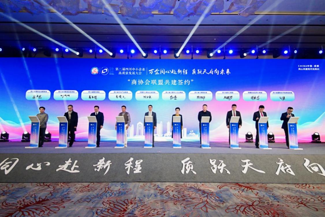 “对接与签约”环节,四川省川联中小企业商会、四川省川商联合会、四川省创新创业促进会、成都市数字产业商会、成都市通用人工智能与物联网产业商会、四川大学总裁(CEO)校友会等20家商协会联盟共建进行签约;四川省川联中小企业商会、中国农业银行成都金牛支行、中国建行银行岷江支行、上海嘉懿萃私募基金管理有限公司、企业家日报社5家金融服务与品牌传播战略合作签约;四川新蓉电缆有限责任公司、四川天链机器人股份有限公司、海南超维产业投资有限公司、千里智行汽车、四川鸿创光远智能科技集团、成都中鑫跃科技有限公司6家产业链技术合作签约。