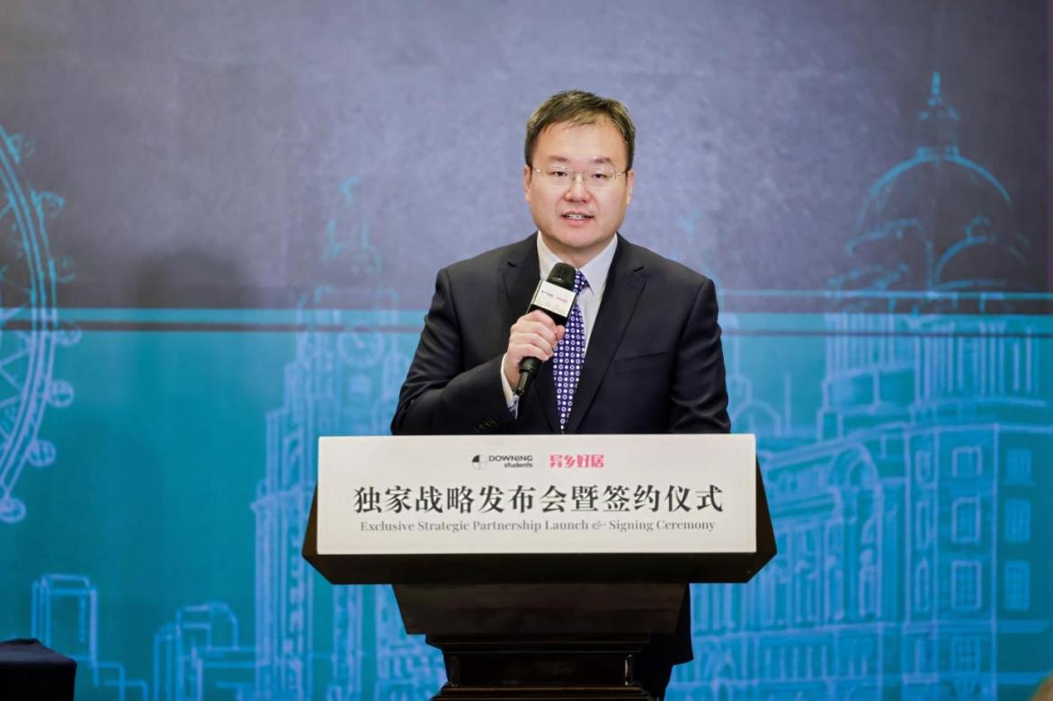 天津市红桥区副区长韩珺应邀出席并发表致辞,对此次异乡好居与 Downing Students 的中国区独家战略合作表示祝贺,高度肯定了异乡好居在赋能国际人才住宿服务、链接全球优质资源方面的行业价值,并见证了这一重要合作时刻。随后的开场致辞环节中,异乡好居 CEO 印建坤与英国Downing Students CEO Bay Downing 分别发表致辞。