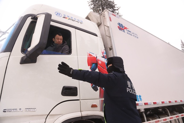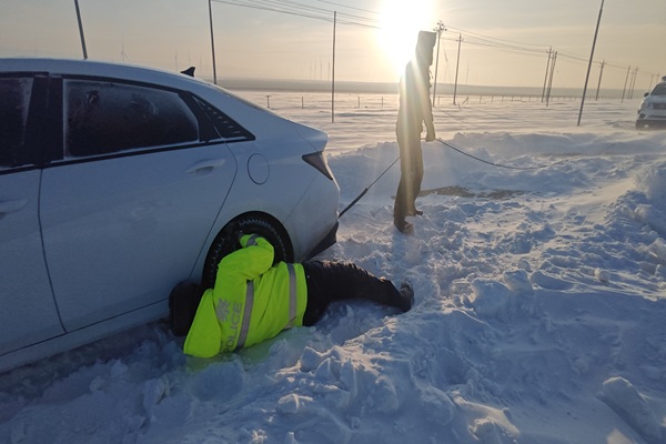 在国省干道、城乡结合部、农村山区等重点路段,采取“定点查、动态巡”模式,提醒驾驶员“降速、控距、亮尾”。在各交通执法站配备热水、方便面、急救包、防滑链等应急物资,为滞留群众、过往驾驶员提供免费补给。同时当强暴雪席卷边境公路,积雪没过车轮、路面冰封如镜时,救援车辆第一时间奔赴现场。民警们手持铁锹、推雪铲,顶着刺骨寒风清理路面积雪,用牵引绳拖拽被困车辆,为滞留的司乘人员递上热水和应急食品,让冰封的道路重新“苏醒”。