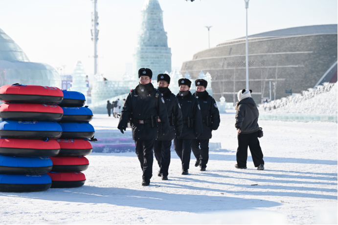 为全方位守护景区安全,松北分局构建“立体巡防+智慧防控+群防群治”三位一体安防体系,每日常态化部署执勤警力,推行“车巡+步巡+视巡+空巡”四巡联动机制,统筹带领景区安保人员、志愿者等群防群治力量,对冰雪大世界全域开展巡逻。同时,科学规划驻巡点位与动态巡逻路线,将景区划分为九宫格,以网格为最小单元,就近开展纠纷调处、游客帮扶、安全宣传等工作,织密织牢景区安全防控网。