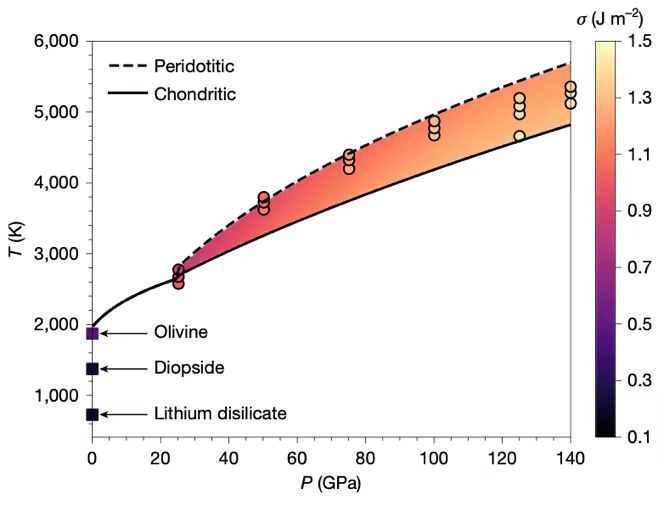 地球早期岩浆洋的结晶固化方式,是决定地幔化学组成与动力学演化的关键初始条件,其中下地幔主导矿物布里奇曼石的成核行为,因实验条件限制长期研究缺乏。研究团队立足前期对岩浆洋熔体结构与凝固行为的探索,聚焦高温高压下布里奇曼石—熔体界面能展开系统分析。通过机器学习势函数驱动的大规模分子动力学模拟,结合先进的增强采样方法,团队首次在深部岩浆洋的极端环境中完成该界面能的系统测算,发现其数值随压力升高显著增大,可达常压硅酸盐—熔体体系的十倍以上。