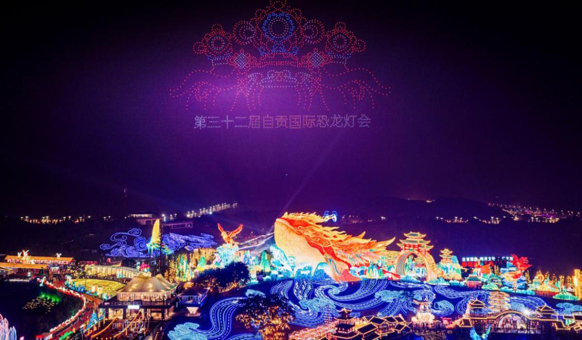 2026架无人机如星河倒悬,点亮盐都夜空,万千盏彩灯似锦绣铺陈,映红游人笑颜。1月23日晚,自贡·中华彩灯大世界化作璀璨灯海,第32届自贡国际恐龙灯会亮灯暨全省迎春文旅促消费活动启动,一场以灯为媒、融汇传统与现代的文旅盛宴在马年新春前夕火热开场。