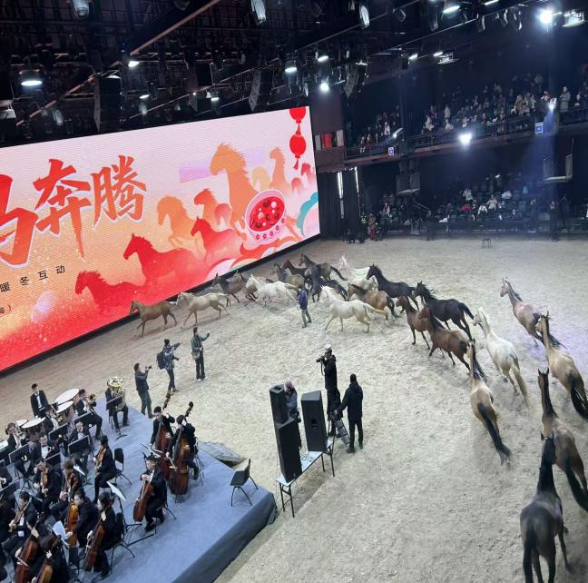 室内马场以西域男声合唱团、交响乐团以及韩嘉怡、江布、张太雷等歌手带来《世间赠予我的》《父亲的草原,母亲的河》等独唱曲目将“交响贺春”引入高潮。当《赛马》旋律响起,骑手驾驭汗血宝马登场,立马、编队奔驰、马术特技等表演与交响乐完美呼应,马蹄声与乐声交织,绘就“万马奔腾”壮阔画卷,赢得阵阵掌声,让观众在视听盛宴中感受新疆人文之美与家国情怀,也在悠扬旋律中,提前感受新春将至的喜悦。