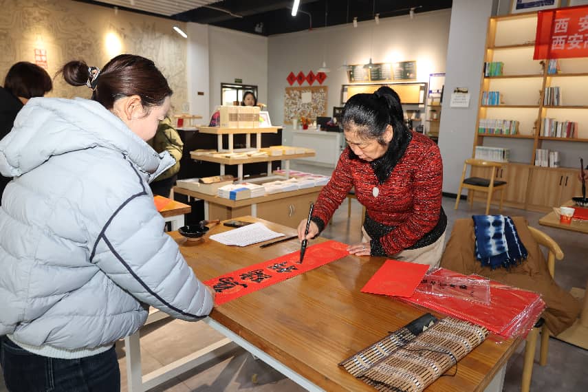 活动现场暖意融融、热闹非凡。来自西安高新区书法家协会常务副主席兼秘书长曹京梅,以及协会牛章民、胡冮涛、翟大学、曹思涵、高瑞成等近10位书法艺术家联袂助阵,挥毫泼墨,笔走龙蛇间,一副副寓意吉祥的春联和苍劲有力的福字一气呵成,吸引了众多群众纷纷驻足观赏、排队领取。