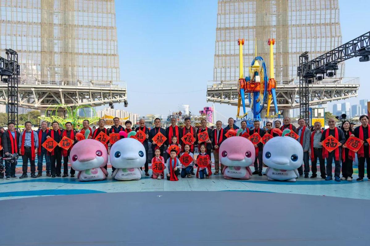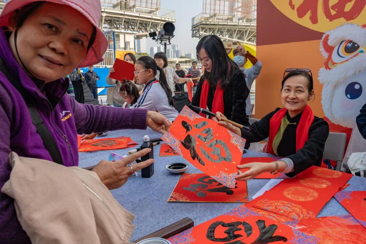 当日,书画名家们在海心沙中央广场的红色书写台前,即兴创作春联与“福”字作品。现场设置的“公益挥春区”,市民可自由选择吉祥语句请书法家现场书写。特地带着6岁女儿来感受年味的李女士,获得一幅“福”字作品,她表示,孩子看到“大湾鸡”人偶在书法家身边互动,特别开心!这种传统与潮流结合的方式,让年味更鲜活。