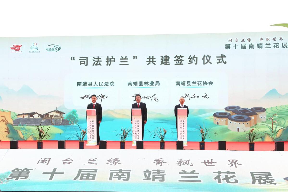 此外,南靖县兰花协会6名会员代表签署兰花诚信经营承诺书,县法院、县林业局、县兰花协会共同签订“司法护兰”共建协议,南靖县兰花协会与中国建设银行南靖支行、南靖县农村信用合作联社签署授信协议,县市场监督管理局党组书记、局长钟亚煎为大家科普“南靖兰花”地理标志专用标志及规范使用方法,南靖县政府副县长杨杰为6家获得授权企业代表进行南靖兰花地理标志专用标志授牌,中国花卉协会兰花分会会长朱根发发布中国(南靖)兰花交易日,定于每月18日在南靖兰花示范园举办,为全国兰花爱好者、经营者搭建的常态化展示窗口、精准化对接平台。