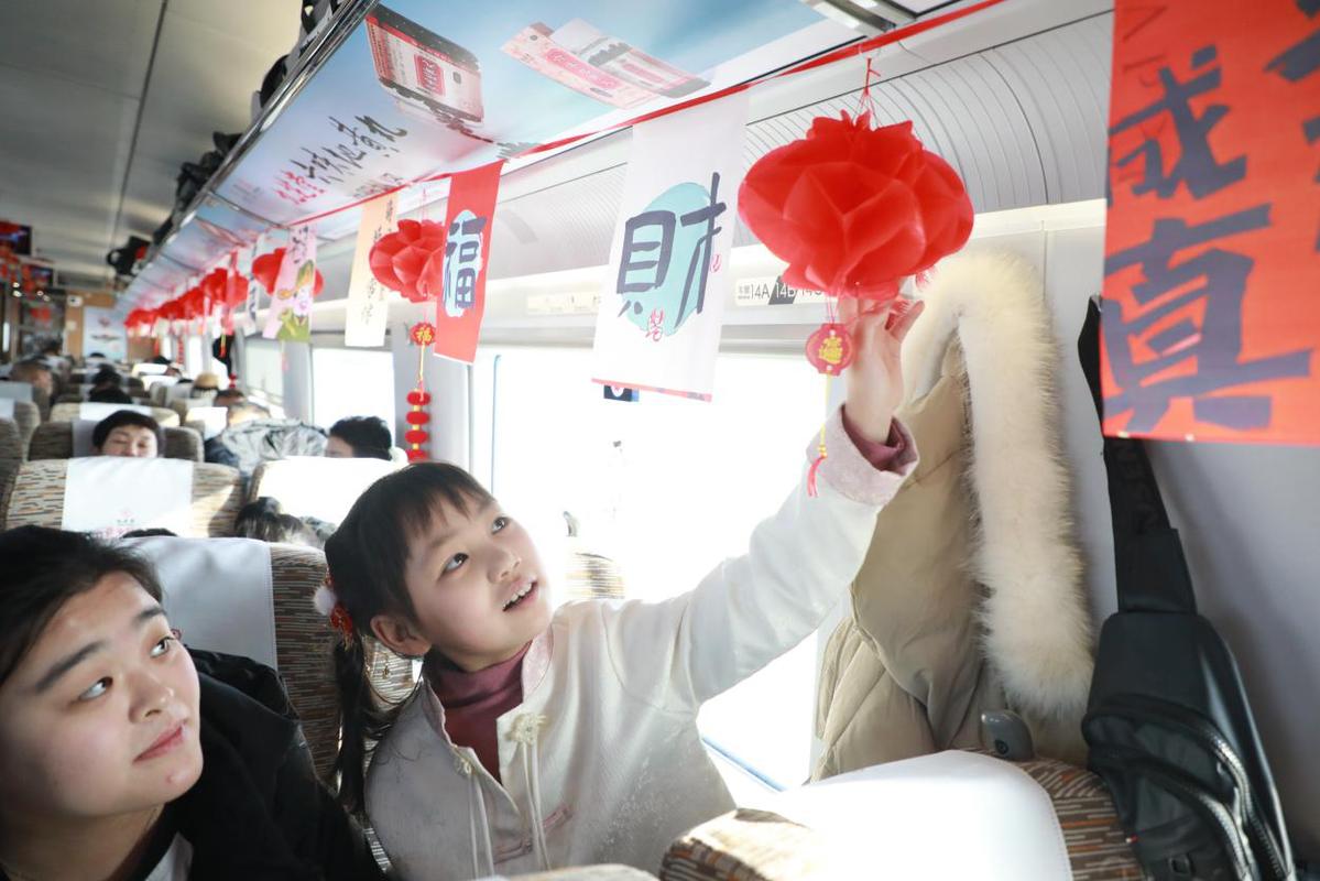在贴窗花互动环节,旅客们亲手粘贴寓意吉祥的窗花,窗外是飞驰而过的北国雪景,窗内是红火温馨的节日场景。工作人员还向旅客讲解腊八节的来历与习俗,让旅途成为生动的文化体验。