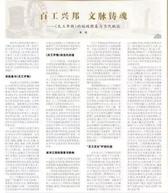 值得强调的是,《天工开物》在分宜的诞生,不是历史的偶遇,而是学术生态、个人际遇、经济地理与思想激荡在特定时空完美共振的结果。第一,分宜县在明代中叶已形成技术实践与知识整合相互促进的独特学术生态,为《天工开物》的诞生提供了丰沃土壤。第二,宋应星在分宜的任职经历,构成了其学术生涯中关键的“科研静修期”,这种制度性闲暇与实证方法的结合,催生了《天工开物》的创作。第三,分宜的经济地理区位使其成为赣西产业网络的关键节点,这种区域经济整合为《天工开物》的创作提供了丰富素材。第四,晚明实学思潮的兴起与知识阶层的转型,为《天工开物》的诞生提供了思想基础。