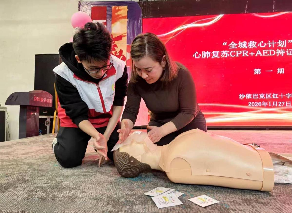 为进一步普及应急救护知识,筑牢基层生命安全防线,1月27日,乌鲁木齐市沙依巴克区红十字会在永丰镇举办首期心肺复苏(CPR)+自动体外除颤器(AED)持证培训班。永丰镇六村一社区工作人员、乡镇干部及辖区群众50余人参与培训,系统学习急救技能。