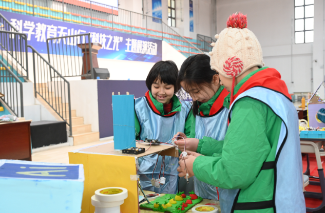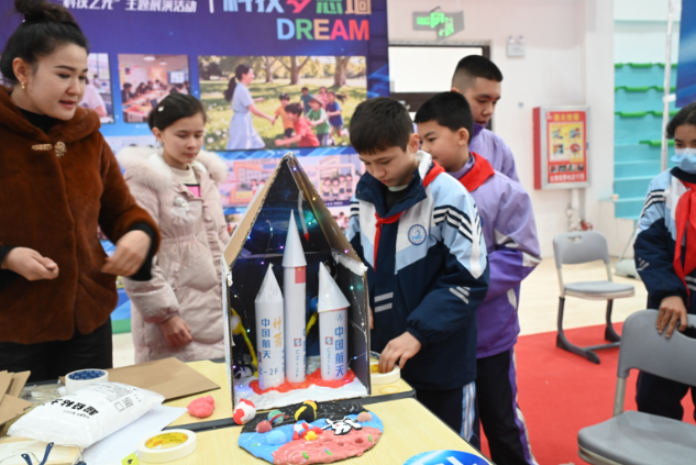 在“科技之光”主题展演现场,疏附县百余名中小学生,用黏土、导线和简易电子元件为材料,动手搭建心中的未来科技图景。智慧农场、生态牧场、太空基地等一件件充满想象力的作品精彩呈现,生动展现出边疆青少年对科技进步的理解与向往。