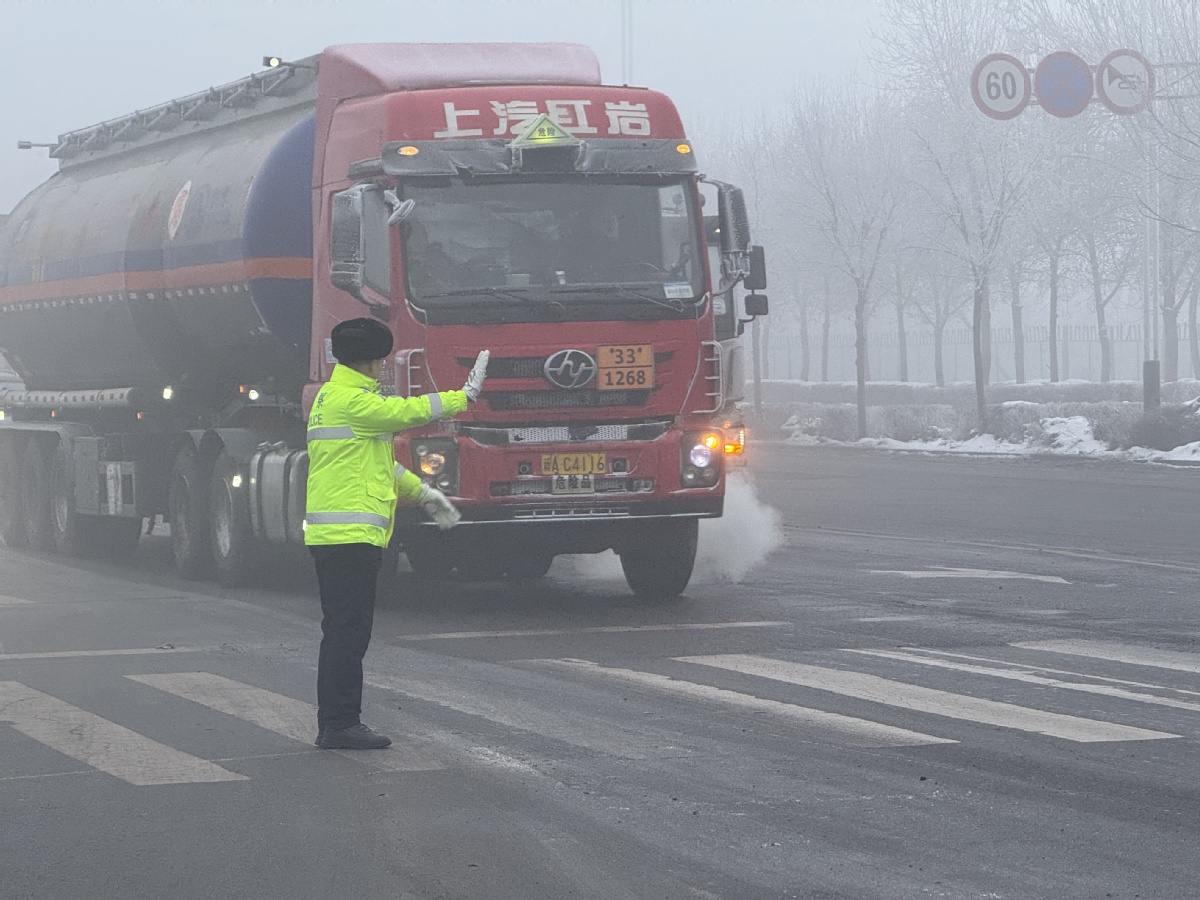 1月30日,在新疆昌吉市西外环与乌伊路交叉口,交警正在疏导危化车辆有序通过。(刘华摄)