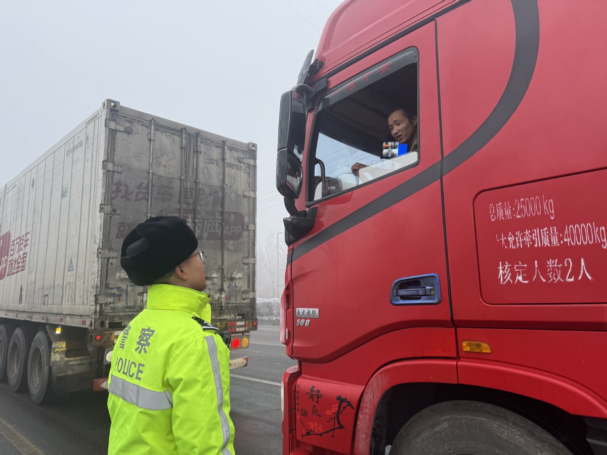货车司机佘文刚说:“今天天气不太好,雾也大、路面也滑,路上也比较危险一点,我们驾驶速度也放得很慢。按照交警的指挥,打开双闪、保持安全距离,有序地通过。”