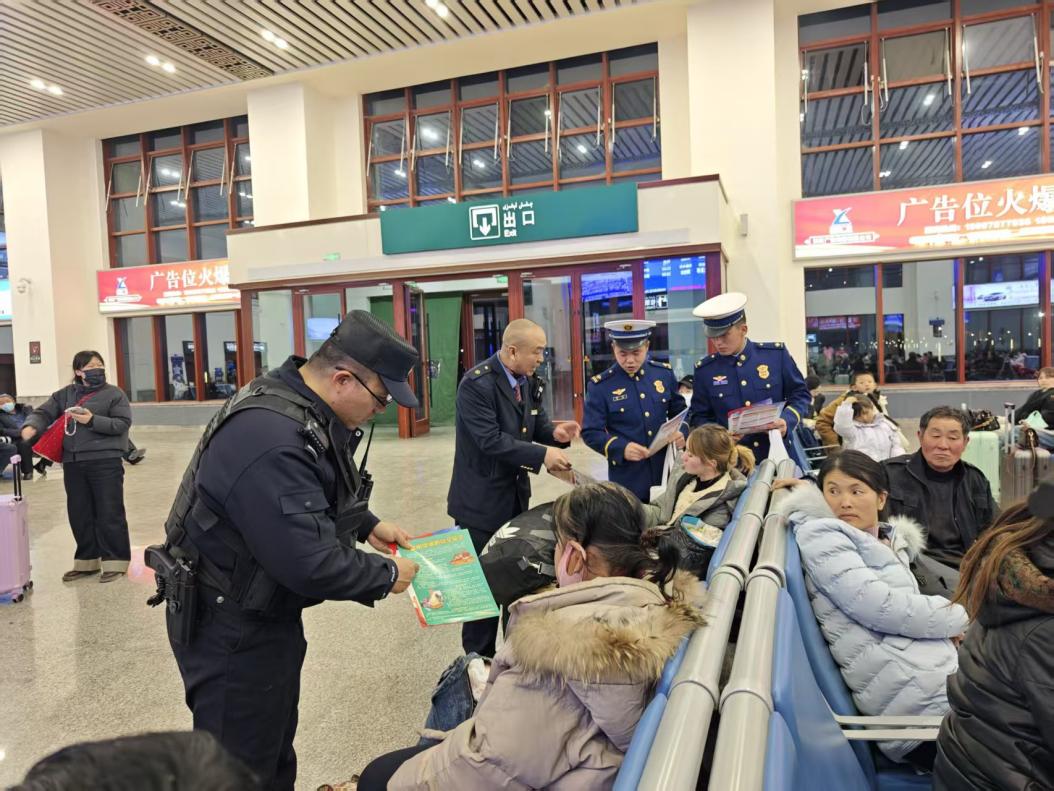 1月31日,阿瓦提县火车站内,铁路民警会同消防部门和站内工作人员对旅客开展宣讲。玉苏甫·肉孜 摄。