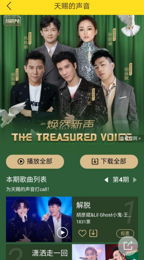 阳春三月,“天赐好歌”无极限!3月21日晚,《天赐的声音》第四期正版音源同步精彩上线节目官方合作伙伴酷我音乐。本期胡海泉、张韶涵、胡彦斌、韩雪四位音乐合伙人联袂黄雅莉、宝石GEM、小鬼王琳凯、张蔷、苏诗丁、盘尼西林乐队等飞行合伙人,共同献上《解脱》《潇洒走一回》《一样的月光》《寓言+引路的风筝》《柠檬树+路灯下的小姑娘》《城里的月光》等6首抓耳好听歌曲,胡彦斌与小鬼合作的《解脱》不仅成为当期推荐金曲,更同时登顶酷我音乐当期节目歌曲榜冠军宝座。