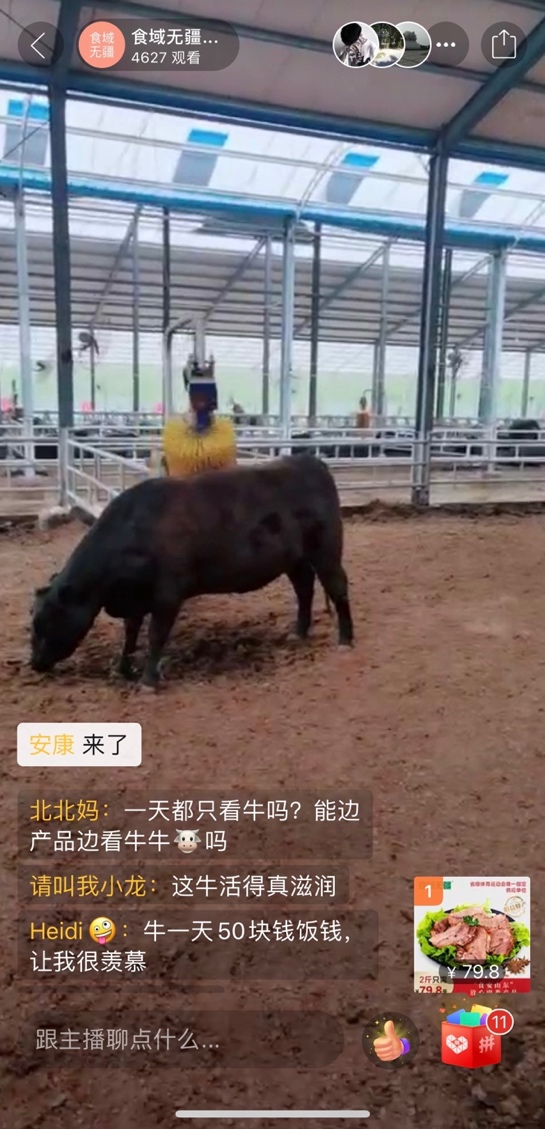 ▲4月16日早上9点,持续13小时的“中国第一牛县”牛肉产业链直播带拼多多网友走进牧场。 图片来源:胡伟