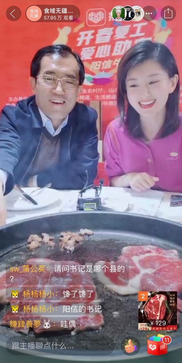 ▲4月16日晚上,在县委书记栾兴刚的助力下,拼多多阳信牛肉直播间卖出了3000片牛排。 图片来源:胡伟