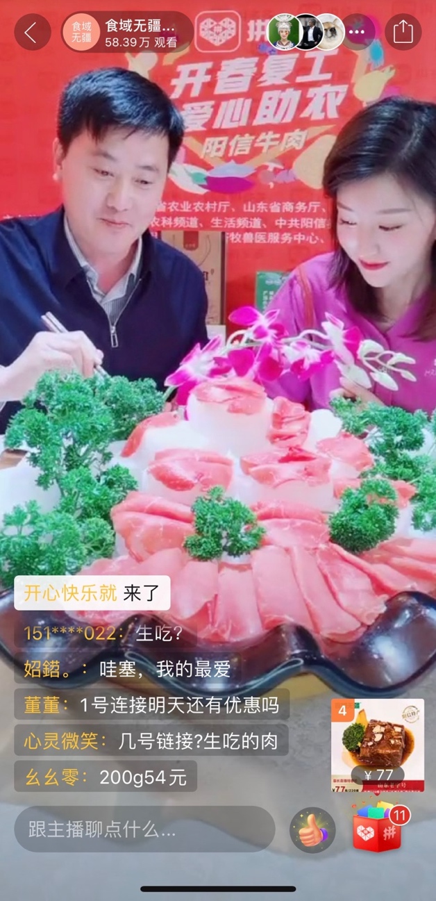 ▲4月16日晚上,阳信县副县长张新国接力“吃播”,生吃起了牛肉刺身,摆起了全牛宴火锅,赚足了59万拼多多围观网友的眼球。 图片来源:胡伟