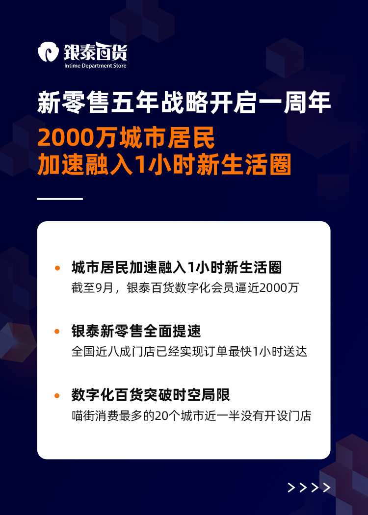 “未来围绕人们的家庭将形成一个个1小时新生活圈,在新生活圈内,人们购物、出行、生活、娱乐都将前所未有的便捷,”陈晓东表示,“通过对商业场景的数字化重构,银泰将加速布局1小时新生活圈,为消费者的圈内生活提供极致体验。”