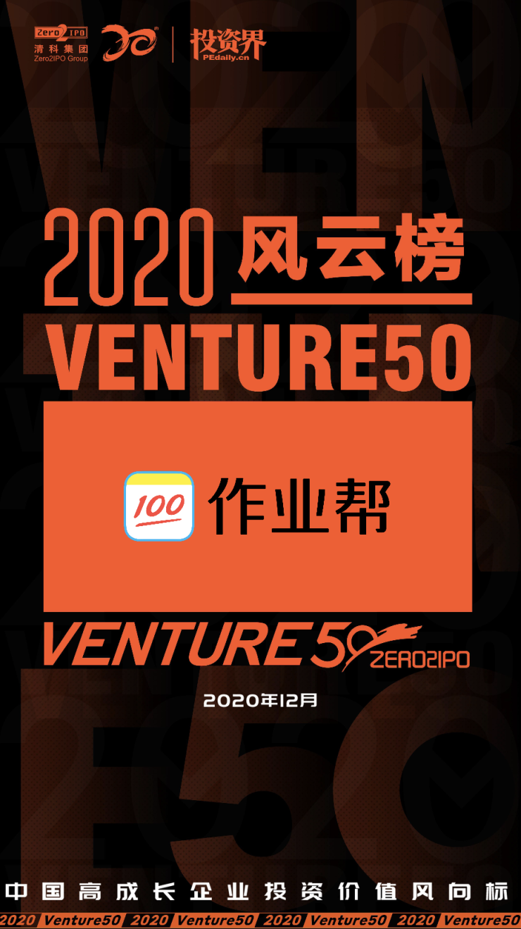 近日,清科集团、投资界联合举办的“2020中国创业武林大会”上,2020年度“中国最具投资价值企业50强”(Venture50)风云榜榜单揭晓。国内最大的K12在线教育公司作业帮,凭借领先的综合实力及投资价值登上榜单。