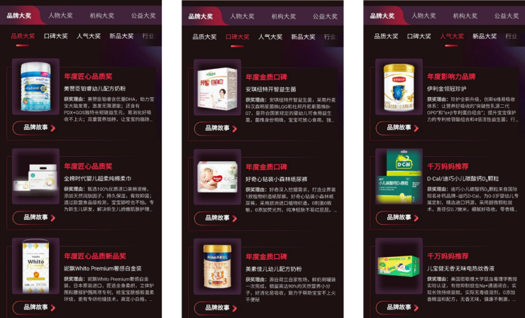作为国内最权威的母婴行业奖项之一,今年的金树奖奖项愈趋多元化,从公益、人物、品牌到具体的母婴日常产品,覆盖母婴家庭生活的各个维度。得益于始终贴合用户需求及喜好的产品服务能力,宝宝树金树奖已成为母婴人群的消费指南,为数众多的宝宝树用户,也在金树奖评选期间积极分享他们对心仪产品的口碑评价,为其他母婴用户提供参考。