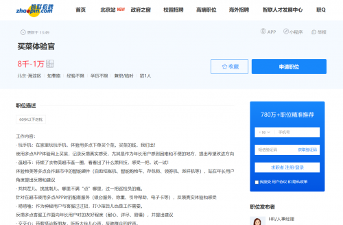 据智联招聘职位描述,“买菜体验官”的主要工作内容是对多点Dmall在线下商超提供的数字化服务中提意见。具体而言,“买菜体验官”在家使用多点APP体验网上买菜,记录作为年长用户感到困难和不便的地方,提出希望改进的方向;日常逛超市中,体验北京物美、麦德龙超市的自助结账机、智能购物车、智能存包柜等智能服务,站在年长用户角度提出反馈和建议;针对在超市使用多点APP时的收银服务、称重、引导帮助等配套服务,反馈真实体验和感受;反馈多点客服工作面向年长用户时的友好程度(耐心、详尽、易懂),并提出建议等。