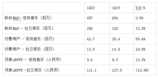 [*]关于上述运营指标的定义,请参阅公司于2020年3月25日提交的2019年20-F简介部分。在截至2020年3月31日的三个月里,公司社交娱乐服务的移动MAU与付费用户数据包括来自酷狗旗下的在线K歌移动应用程序“酷狗唱唱”约900万的移动MAU以及20万的付费用户,其2019年同期移动MAU与付费用户数据分别为约100万与3万。