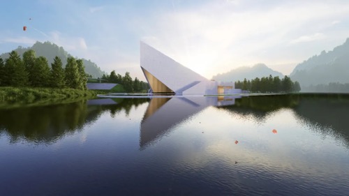 鸟瞰位于河畔的诗之礼堂(效果图)© 安藤忠雄建筑研究所