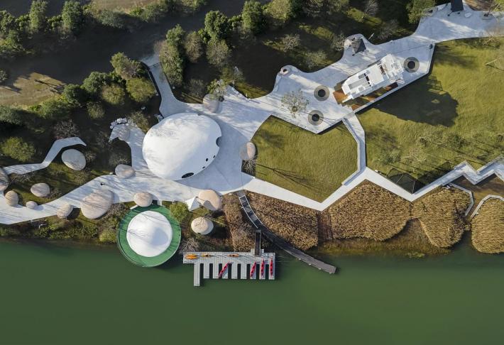 “诗之韵”空间以开放的姿态面朝溪谷而打开,在视线的尽端,“永远的青春”青苹果艺术装置静静伫立着;溪谷、山峰、天空、水面与建筑形成一幅和谐共融的画卷,自然的变迁在时间的流逝中丰富了建筑的表情。