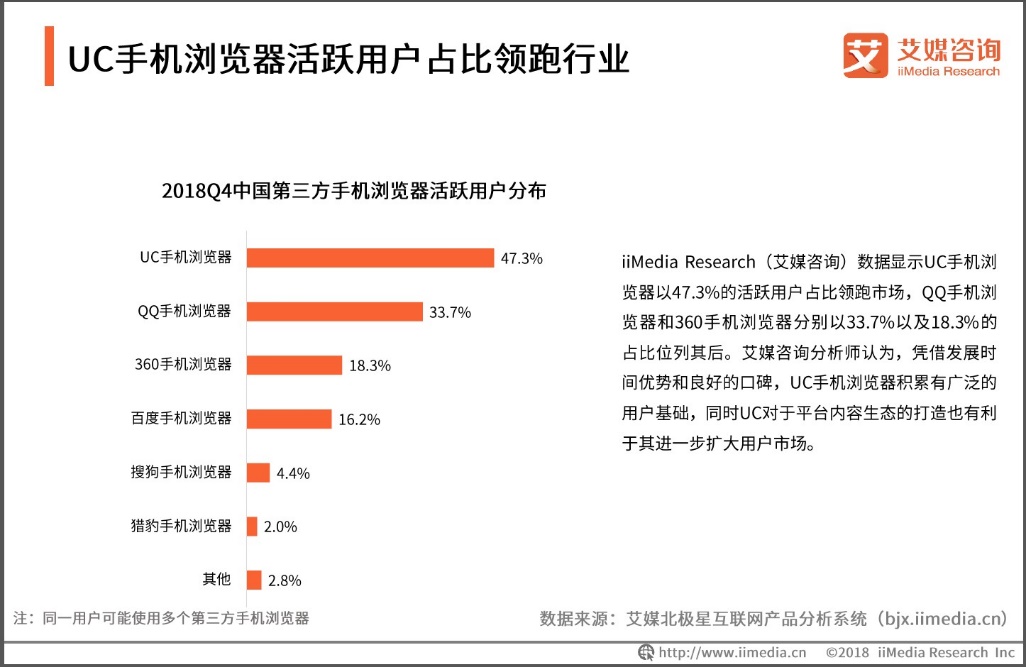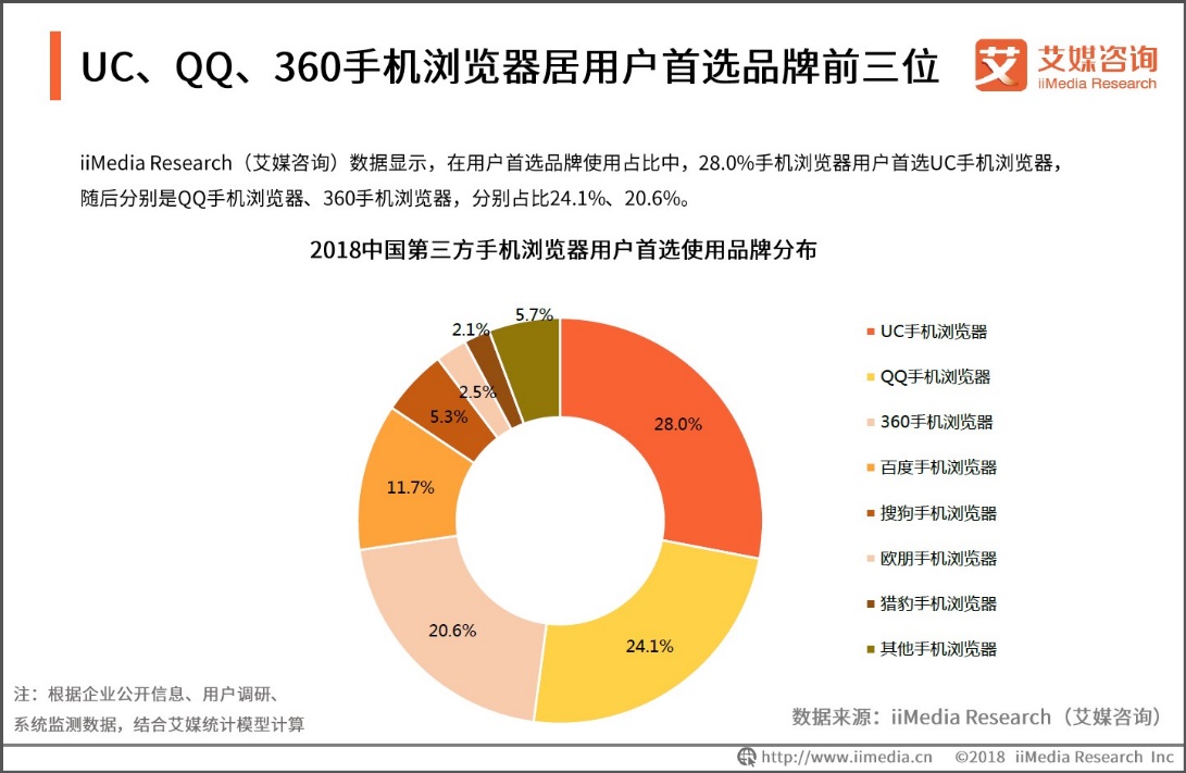 12月21日,知名第三方数据挖掘和分析机构艾媒咨询(iiMedia Research)发布《2018-2019中国手机浏览器市场年度监测报告》显示,2020年中国手机浏览器用户将突破7亿,UC浏览器是用户首选品牌,并以47.3%的活跃用户占比位居行业第一。