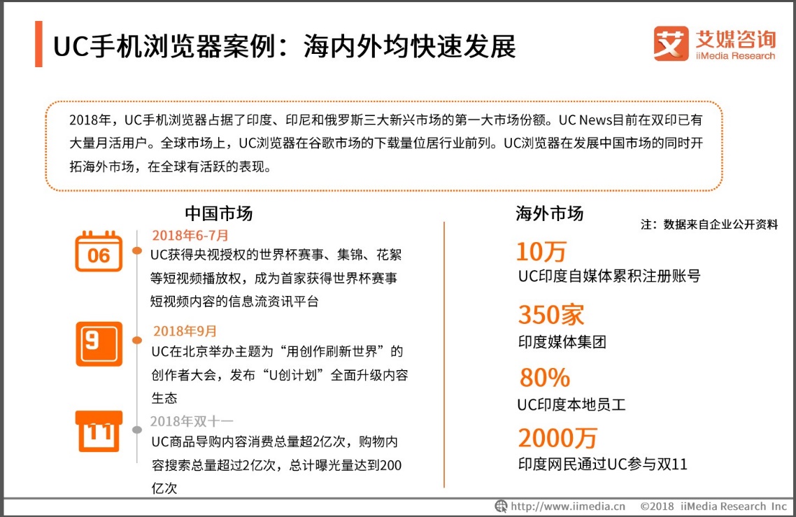 作为中国互联网企业出海的标杆,UC浏览器占据印度、印尼和俄罗斯三大新兴市场份额第一。据悉,印度UC Browser月活用户达到1.3亿,印尼UC浏览器月活超4000万,UC印度内容生态月活用户约1亿,印度用户在UC内容平台的日均消费时长为20分钟。
