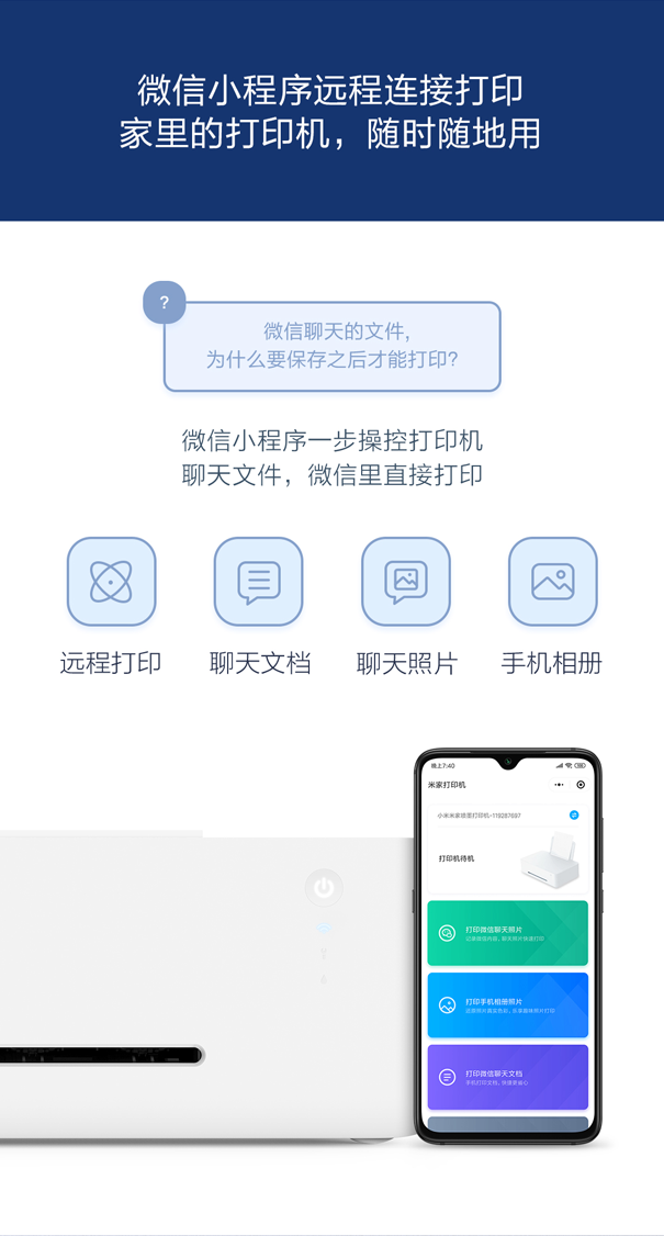 电脑首次连接打印机,无需安装驱动,不管是macOS还是Windows系统,都可直接打印;打印也不再依赖电脑,使用米家App即可一步连接打印机,手机、平板皆能远程打印,苹果和安卓用户均可享受该功能;使用微信小程序也可一步操控打印机,不但可以选择打印手机相册照片,而且微信聊天文档、聊天照片无需下载,就可直接打印。