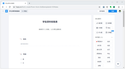 而现在,使用金山办公出品的信息收集服务「WPS表单」,老师们只需把各个收集项设置成一个个题目,以同一个链接或小程序的形式发送给学生填写即可。届时,每个学生填写的内容,都能自动汇总到一张表格中,简单又高效;而且收集到的信息只有老师才可以看到,真正确保了学生们的数据私密安全。