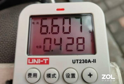 看着测电量插座显示的数据,上演了一场充电较量的“速度与激情”,在220V的电压下,普通电池的充电功率也就在230-250瓦左右,而石墨烯电池的最高充电功率达到了1418瓦,搭配着6.607安的电流输入,大大提升了充电效率,仅用十分钟,耗电量就达到了0.428度,是普通电池耗电量的10倍。