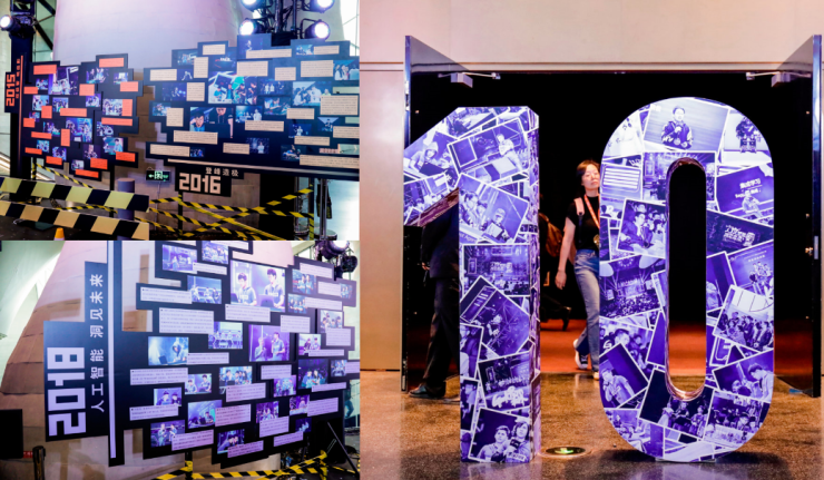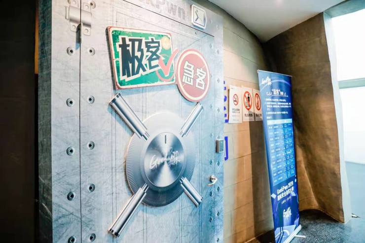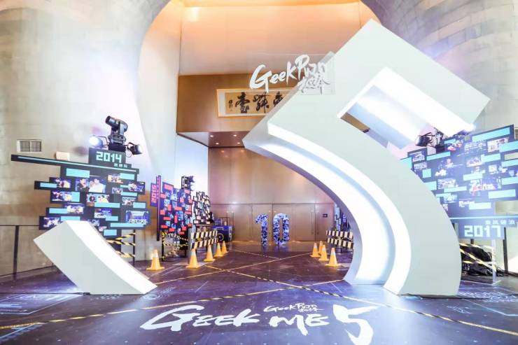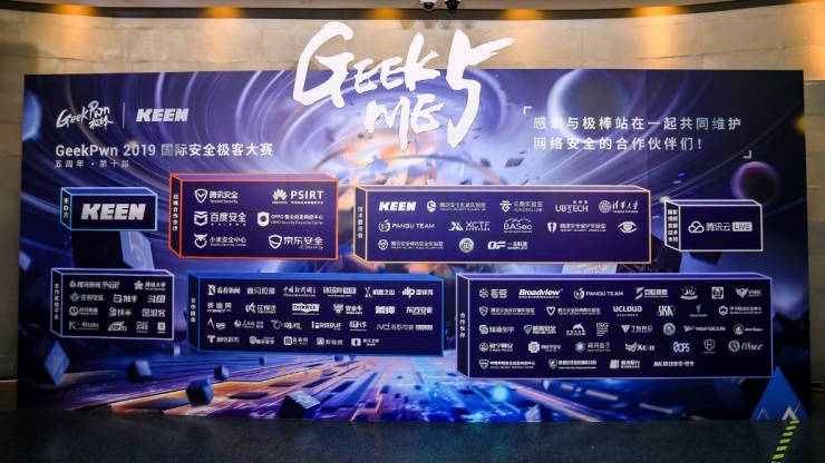 今年GeekPwn的主题是“Geek Me 5无极”,因为2019年是GeekPwn创立的五周年。庆典的气氛随处可见,比如在主会场门口象征“5”周年的极客之门,代表第“10”届大赛的照片集合,入口两侧的GeekPwn编年史,又比如二度主持极棒、依旧激情四射调动全场的黄健翔。