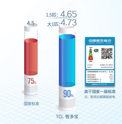 同时作为一台主打节能省电的一级变频空调,TCL智多宝能效仅为1级,能效比高达90%(远高于国家标准的75%),配合ECO节能模式,能够轻松进入精控8小时的控温模式,这在期间压缩机稳定低频运行,尤其适合夜间睡眠时开启,让你整晚安睡也不用担心耗电烦恼。