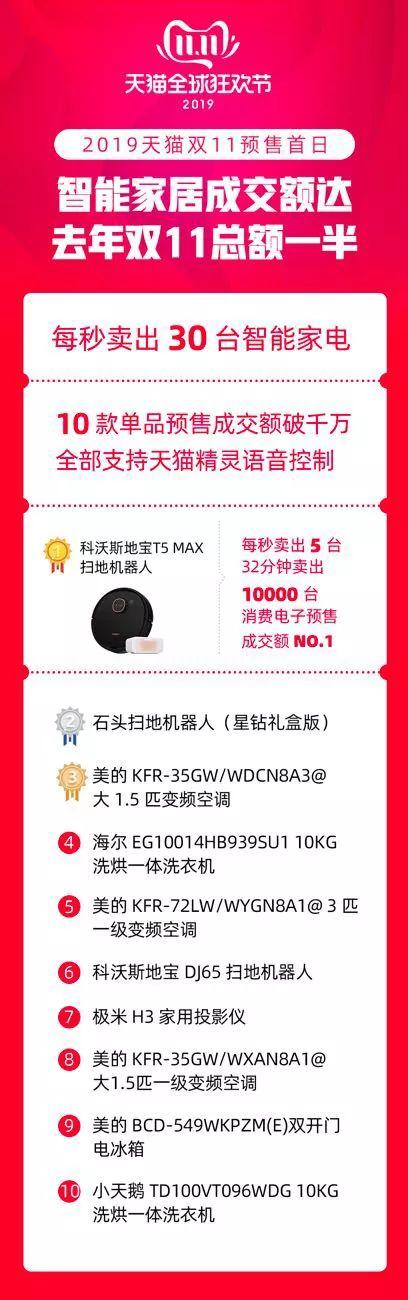 智能家居设备同样表现抢眼,据2019年天猫双11数据,天猫平台智能家居品类全面爆发,10月21日智能家居首日预售额达去年总额一半。首日预售开场的头一个小时,平均每秒卖出30台智能家电;10月21号当天,扫地机器人、冰箱、洗衣机、空调、投影仪等智能家电品类,都出现了“一日千万”的爆款;开场第一个小时,平均每秒售出10台扫地机器人 、5台智能空调。就在11月1日天猫双11开门红当日,IoT智能家居产品继续一路高歌,开卖1小时销售破亿,爆卖5万台,超去年全天销售,半天破3亿成交,全天卖出19万台IoT套智家居设备。而其余支持天猫精灵IoT语音交互功能的智能设备均实现了100%以上增长。
