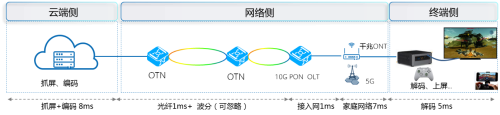 在网吧云游戏的解决方案中,云端和终端时延被大幅优化。通过与芯片厂商直接合作,抓屏及编码时延被控制在8ms以下,终端解码上屏时延小于5ms。在云主机与网吧间通过专线保障网络指标。