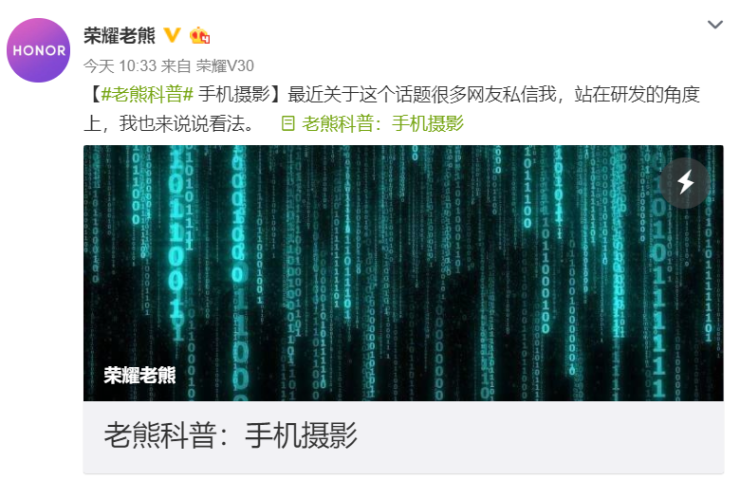 今日上午,荣耀业务部副总裁熊军民(微博ID:荣耀老熊)发布微博,提出了“手机影像线性发展已走到尽头”的观点。他认为线性发展指的是单纯堆砌光学器件,增加像素个数,并站在研发的视角上指出强行堆砌像素个数,手机其它部分却不能匹配高像素需求,不仅不能满足市场,甚至可能导致手机性能变差、发热严重等状况,因为“极端数量的像素处理会对后端图像处理器、CPU、存储总线带来极高的要求”。