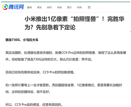 小米CC9 Pro在发布会上公示有“深度定制的相机系统”,包括镜头、OIS光学防抖、1/1.33英寸感光元件和1.6μm 4合1大像素,影像硬件配置看起来很有料。然而腾讯新闻认为该系统没有考虑芯片的重要性,小米CC9 Pro采用了骁龙730G芯片,无法满足亿级像素的需求,导致“拍一张照片要处理好久”,小马拉大车,拍照体验不友好”。也陆续有媒体指出亿级像素使用场景有限,夜景等模式无法使用,可能是算法没能匹配上。熊军民在今天的微博中提到,“在同等条件下,像素的提高是能够带来清晰度上的提升,但手机摄影发展到今天,这一点已远远不够”,拍照成像还包括清晰度、信噪比、动态范围、色彩和伪像等方面。