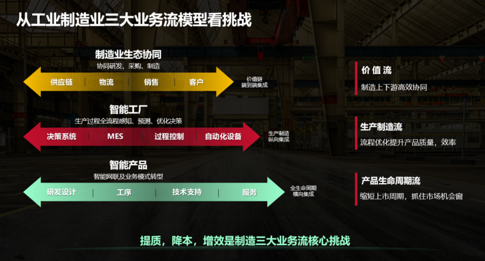 贾永利表示,不仅是华为公司内部,对任何工业制造企业来讲,都有三个主要流程,包括价值流、生产制造流及产品生命周期流。其中,价值流覆盖供应链、物流、销售到最终客户,挑战是制造上下游高效协同;生产制造流覆盖决策系统、过程控制到自动化设备,挑战是流程优化提升产品质量、效率;产品生命周期流覆盖研发设计、工序技术支持到服务,面临的挑战是如何缩短上市周期,抓住市场机会窗。综合来看,提质、降本、增效是制造三大业务流核心挑战。