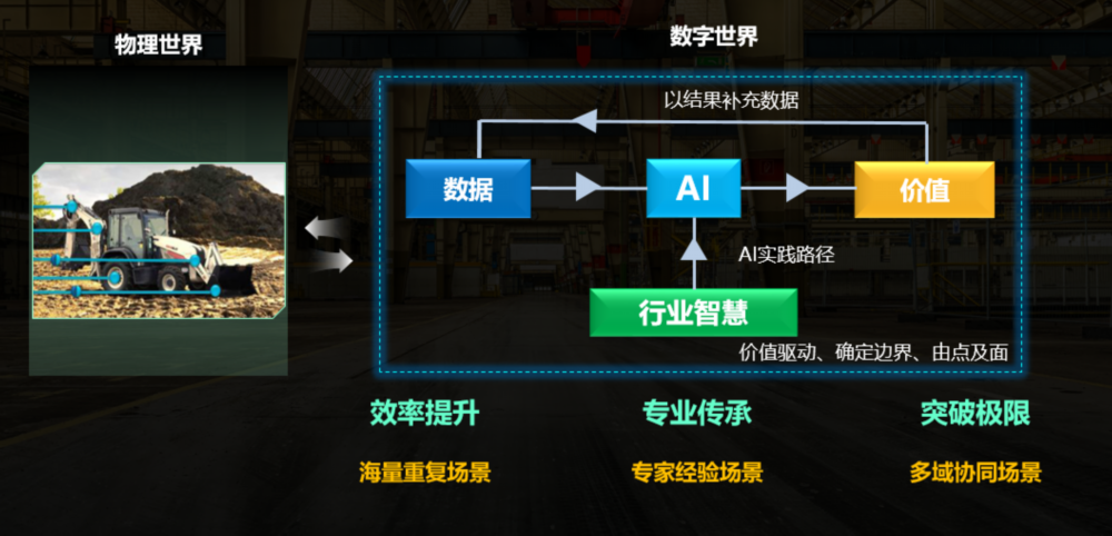 要实现提质、降本、增效,制造业需要智化升级。将物理世界在数据世界建模,结合行业Know-How和行业数据,运用AI技术进行优化,实现价值。贾永利表示,要真正让数据通过AI释放价值,行业智慧必不可少。行业专家要和AI专家深度结合,从数据到AI到价值产生闭环的链条。具体来讲,AI与行业的结合有三大类场景,一类是用AI替代大量重复性工作,实现效率提升;一类是专家经验丰富的场景,以AI辅助专家经验传承。第三类场景叫多域协同场景,也就是以往靠人很难去计算和实施的场景,比如大企业集团之间物流的协调、调度,复杂的城市场景等,AI可以帮助实现“突破极限”。
