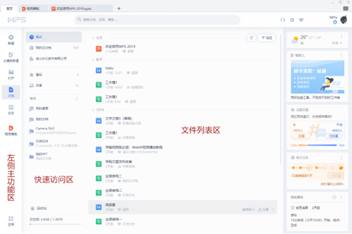 全新升级的WPS 2019 PC版本,在首页采用了类似「风琴折」结构设计,将主界面划分三个明显不同的区域,分别是左侧主功能区、快速访问区及文件列表区,这种设计能够更好地帮助用户在主界面内工作时保持专注高效,提升办公效率!