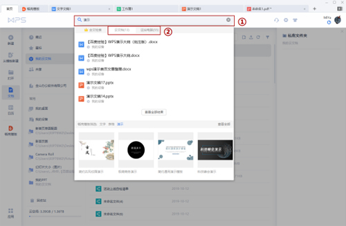 为了改善文档乱放的情况,金山办公还推出了「全局搜索」功能,用户仅需通过搜索文档名称、文档里的内容片段或内容关键字,即可快速定位并找到指定的文档。