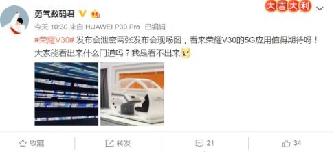荣耀总裁赵明曾表示,荣耀V30是荣耀最强5G手机,是5G时代年轻人全场景智慧生活的中心,将综合运用AI、AR/VR等领域最新成果,通过分布式技术连接各种设备,强力支撑基于年轻人场景的业务和应用,为年轻人打造出综合的5G解决方案,而今天有KOL在微博泄密了两张发布会现场图,科技感的装置和布景似乎也在暗示荣耀V30的5G应用,十分令人期待。