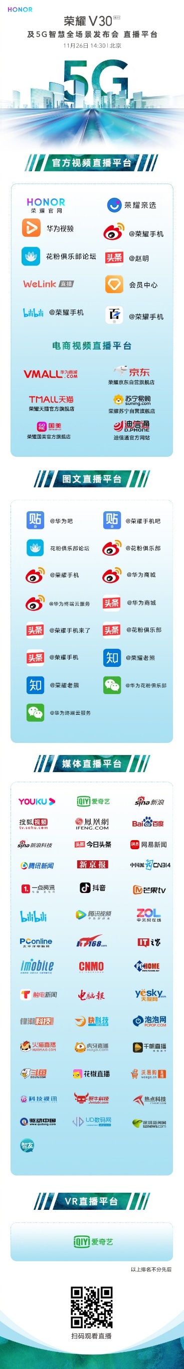 综上所述,作为荣耀首款5G手机,同时也是荣耀2019年压轴机型,荣耀V30势必还有更多亮点待揭晓。荣耀V30及5G智慧全场景发布会将在北京举办,不能前往现场的朋友,可通过线上直播平台观看,11月26日14:30一起见证5G标杆的诞生。