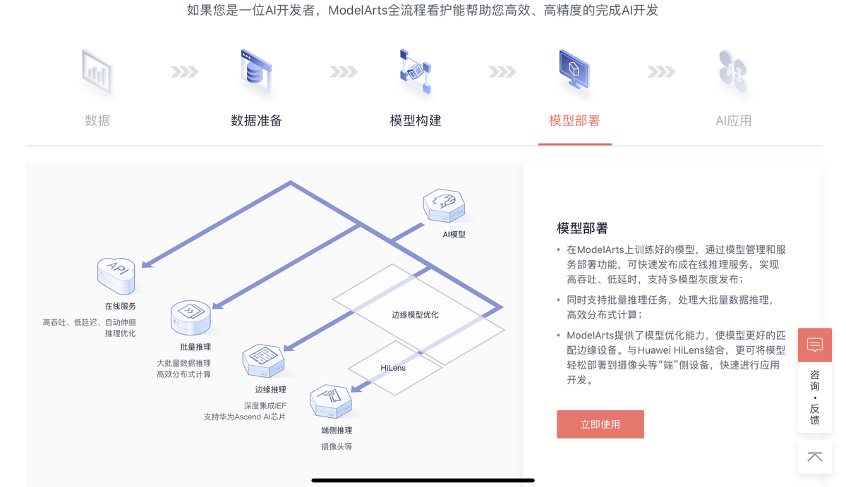 基于「达芬奇架构」芯片赋能,为整个 AI 领域不断上涨的算力提供了解决方案,满足开发者、企业对于 AI 强大算力、多场景算力的需求;利用 MindSpore 和 ModelArts 的场景赋能,在大幅降低 AI 开发门槛、加速企业 AI 开发的同时,还将利用开源持续推进中国自研 AI 框架的发展;围绕 CloudIDE 的云端开发环境,既可以释放华为在 AI 芯片与 AI 框架的核心能力,还可以释放华为云的产业红利。
